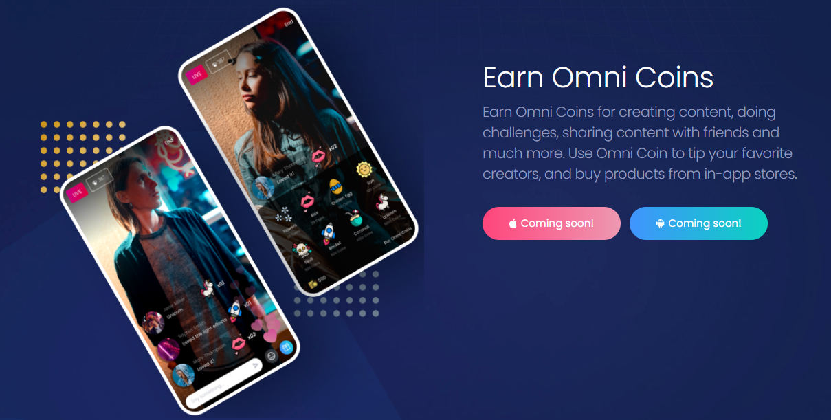 OMNI Coins built on a blockchain based on Substrate, the tooling used to create Polkadot Blockchain. Combination of private and public chains for scalability at low cost. OMNI coin is issued by the OMNI platform. This coin serves as a payment on the platform. Users can use this token to shop for various products on the market, unlock special features, send gifts, tip content creators, and send coins to friends. Users can get these tokens through their activities on the platform or through available exchanges.