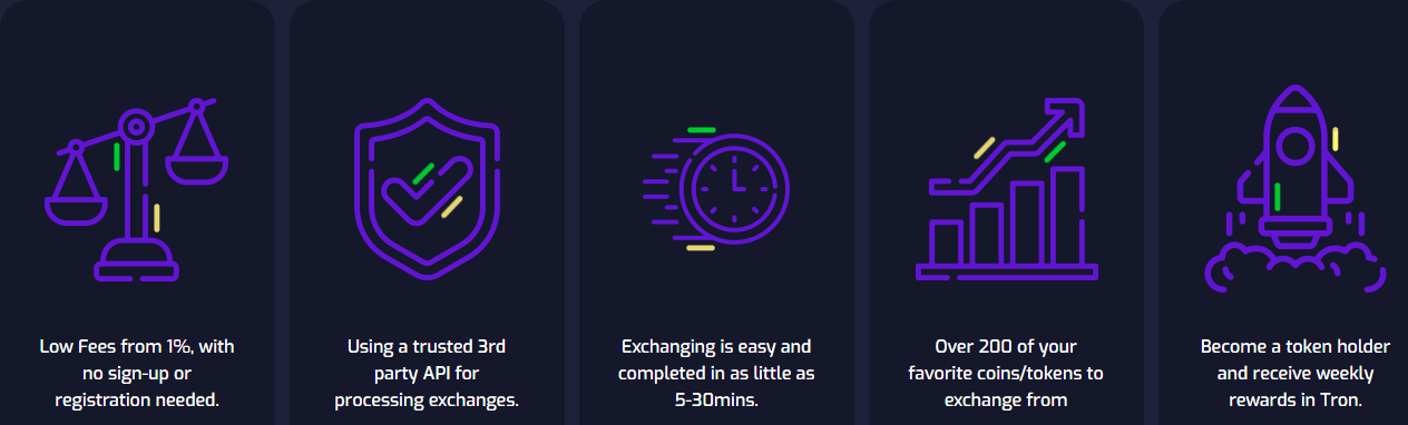 Providing users of the Cryptocurrency Exchange Service with anonymity and zero transaction limits is something users will benefit from the platform. Users can choose from over 200+ of your favorite coins/tokens to exchange from, with 3 easy steps and finished in as little as 5-30 minutes. The team behind this great and one of a kind project has set out to make exchanging Crypto easy by searching for the best rate across major exchanges and without you needing to create an account or login.