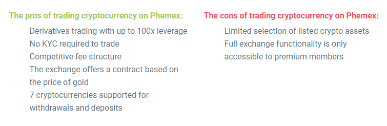 Before we take a closer look at all of the features offered by Phemex, let's quickly go through some of the exchange's main pros and cons.