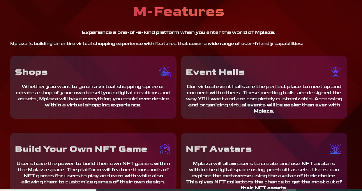 (i) Shops: Users will have the best shopping expirience on Mplaza. will be able to create a space to sell their products or sell their digital assets and creativities. Mplaza will have anything users want to see in their virtual expirience.