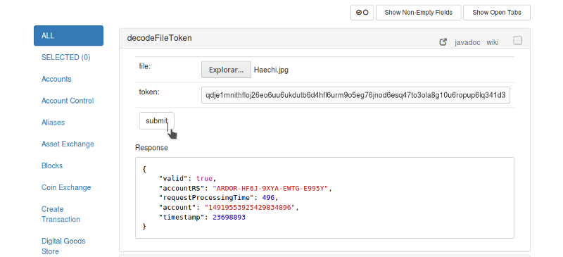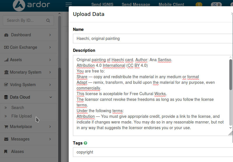 The signature is convenient to register it in the blockchain, so that it is accessible all over the world. To do this, we proceed to upload the signature (the Token) to the Data Cloud of Ardor, labeling it as “copyright”. In the description we state the characteristics of the work, and in text we upload the Token (saved in a text program).