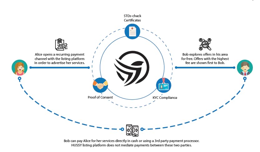 HUSSY has identified that many of the problems with execution of this profession in a culturally stigmatizing environment can be directly attributed to the discrepancy between the need for privacy and the lack of trustworthiness. We see the Blockchain as an ideal tool to remove this discrepancy by enabling all participants to engage in a paid sex in a safe and trustworthy way while respecting their need for the privacy without risking the exposure of their identity.