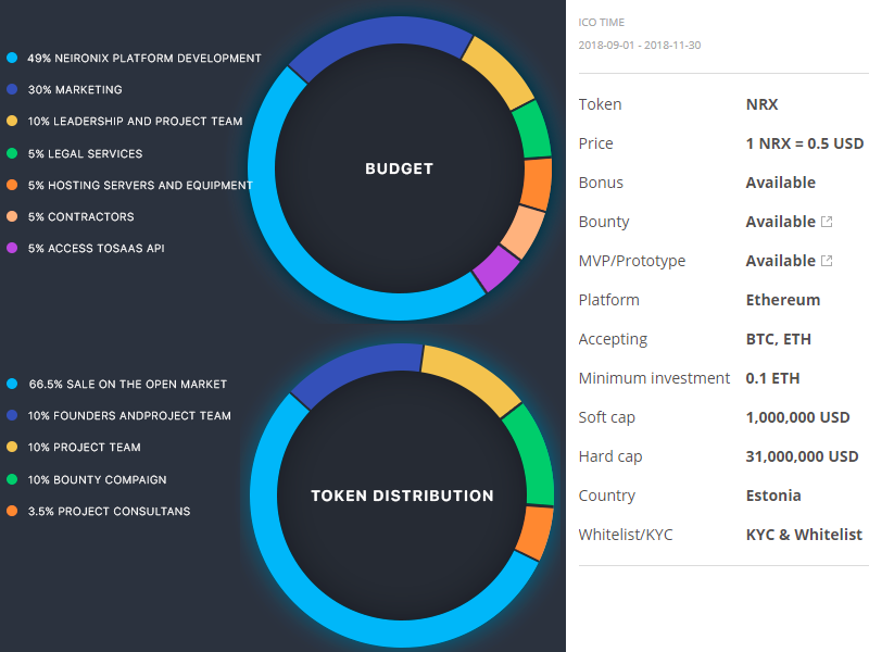 Neironix can be accessed through a website or a mobile app. Using it requires a monthly subscription fee paid in fiat, BTC or ETH. The three different subscription fees are aimed at private, professional and institutional investors, starting at 20, 60 or 3000 USD per month respectively. The first tier grants access to the basic ICO and cryptocurrency market data, including ICO ratings, analytics and notifications. More advanced tiers receive additional information, such as more in-depth historical and media analysis and the structural analysis of ICOs and their major investors, as well as warnings regarding market manipulations. ICO projects have access to special features such as token bidding and marketing analytics with automated suggestions for ad placements, plus an ICO checklist. Companies could promote their ICOs on the platform with premium listing, banners, press releases, direct e-mails and other methods, paying for all of those services with NRX tokens.