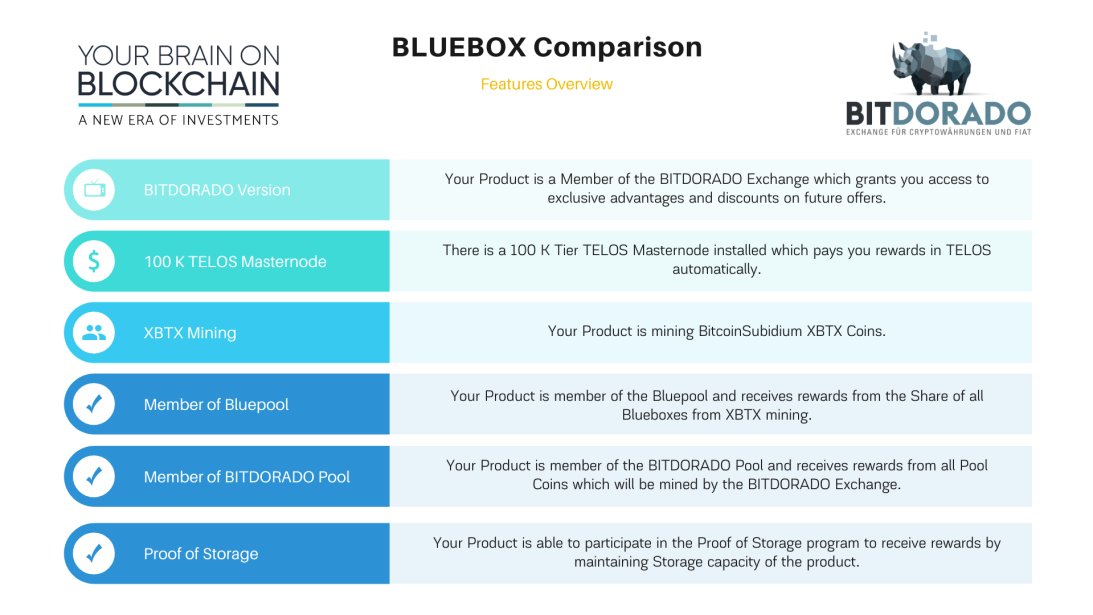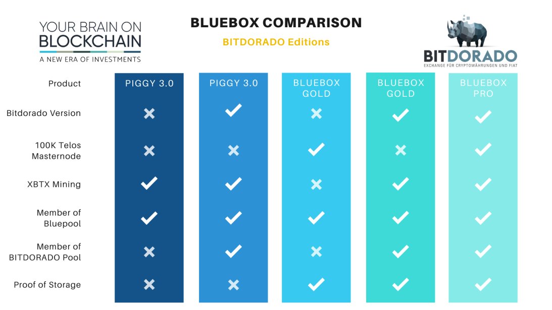 - With Bluebox Gold there is no 100k Telos masternode but XBTX mining as well as Bitdorado pool membership.
