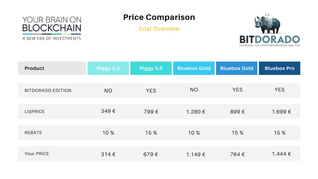 Price comparison are shown on picture below. As mentioned Bitdorado edition devices have advantages and grant access to future offers from Bitdorado.exchange. But if you want to enjoy all benefits and options Bluebox pro might be good choice to join Bitdorado family.