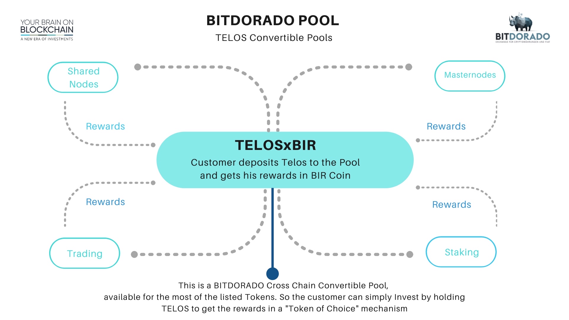 Bitdorado convertible pools are cross chain pool solutions which can be run as two coin pair input and a "token of choice" reward output mechanism.