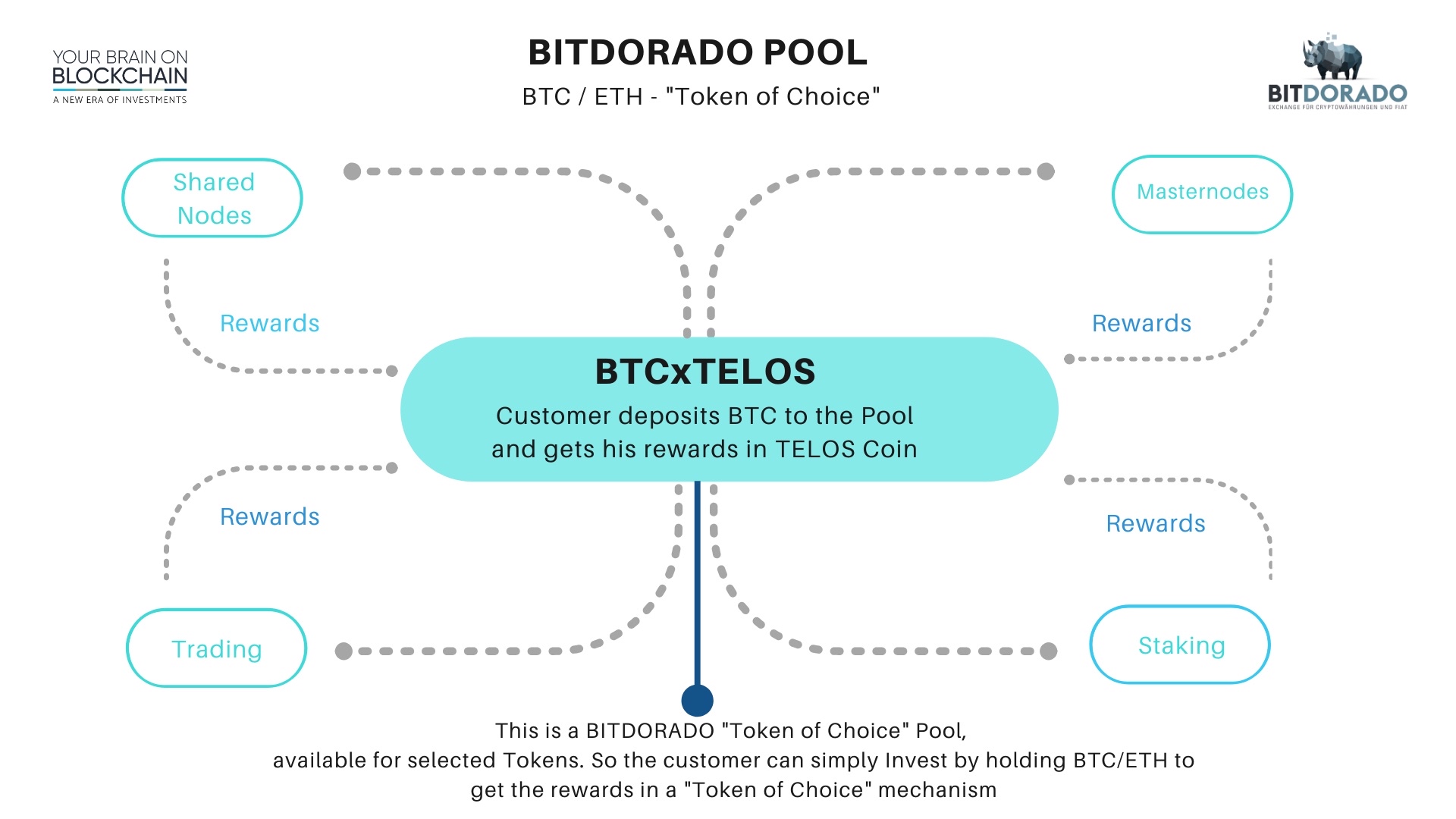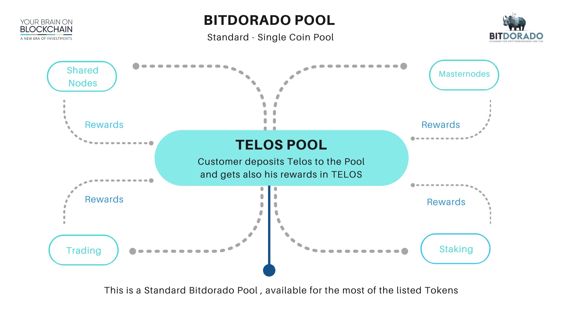 This means user make deposit in one cryptocurrency and get rewards also in same currency. Standard Bitdorado pool is available for the most of listed tokens. User get his rewards from several sources like masternodes, staking, trading or shared nodes.