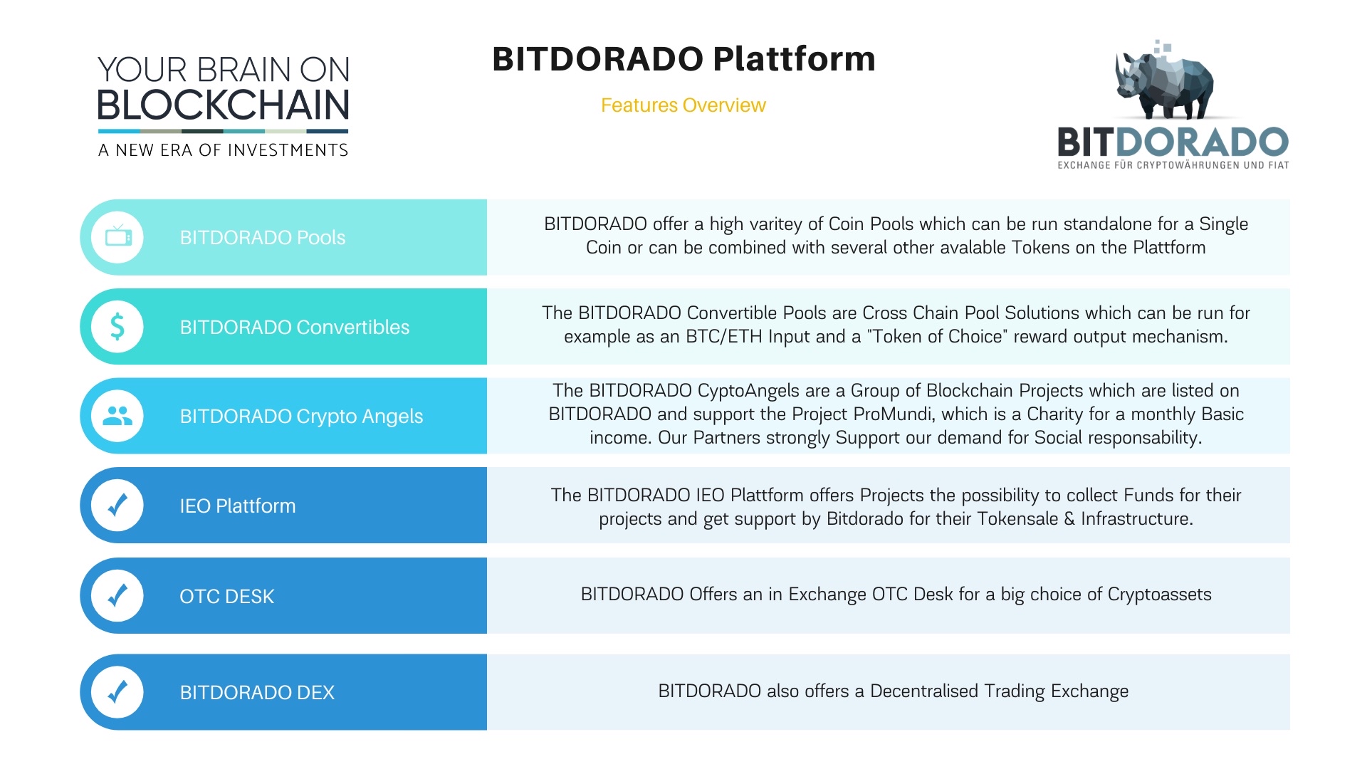 The Bitdorado crypto angels are group of Blockchain projects which are listed on Bitdorado and support https://ProMundi.de project, which is a charity for a monthly basic income. Partners of Bitdorado strongly support demand for social responsibility.