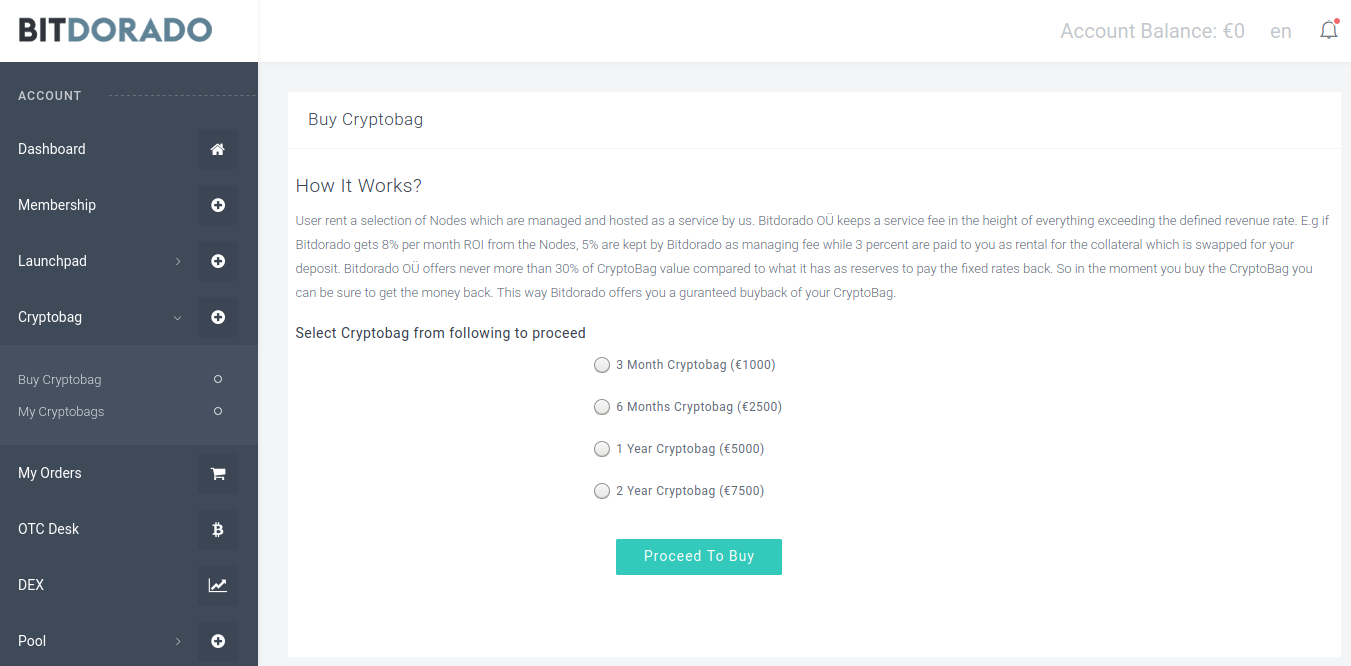 Users rent a selection of masternodes which are managed and hosted as a service by Bitdorado. Bitdorado keeps a service fee in the height of everything exceeding the defined revenue rate. For example, if Bitdorado gets 8% per month ROI from the Nodes, 5% are kept by Bitdorado as managing fee while 3 percent are paid to you as a rental for the collateral which is swapped for your deposit. At the moment users who buy the CryptoBag can be sure to get the money back.