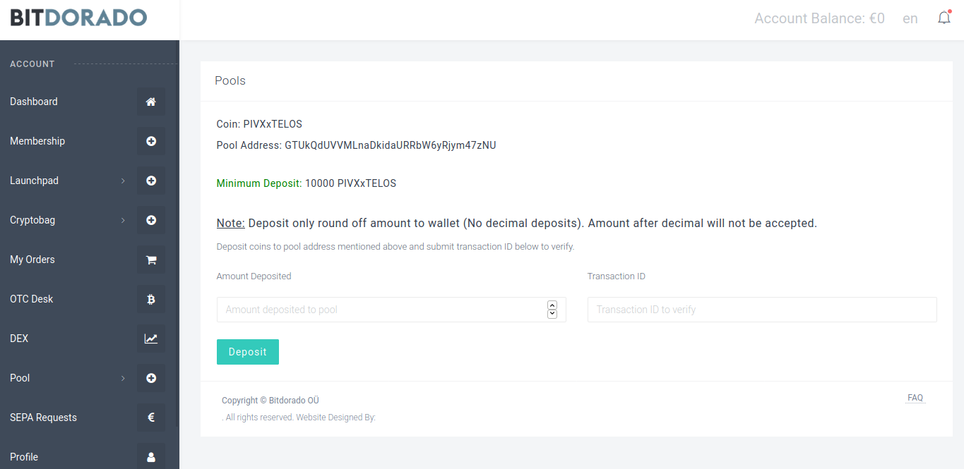 After clicking on “Join pool” you ‘ll get information of how many Teloscoins or other coins you need to deposit. Enter amount, send Teloscoins (or other), enter valid txID and confirm. After that, you only need to wait for approval of your deposit to the pool, which is very fast.