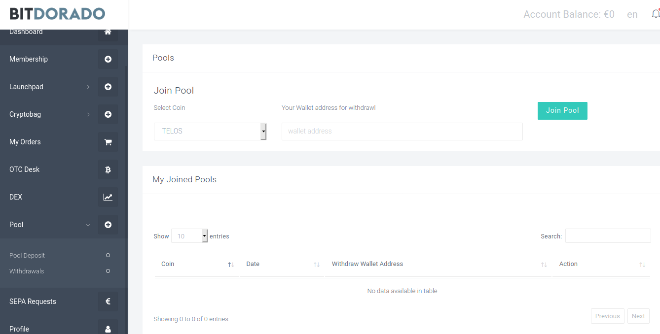 For now, the most interesting part for users are Staking pool. Everyday the Bitdorado team adds new coins to the pool. How to join a pool?