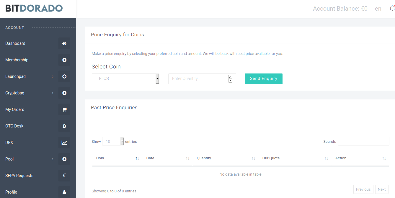 Here you can buy/sell cryptocurrency at OTC (Over The Counter, from peer to peer). You can place an inquiry by selecting coin and amount. Bitdorado OTC desk will be back to you with best price available.