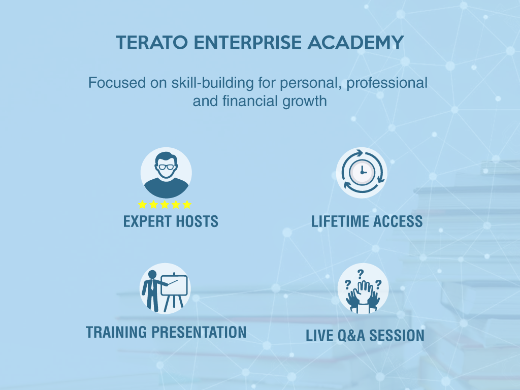 Terato Enterprise academy allows you to become a part of a diverse approach to learn and gain knowledge. This helps businesses to improve performance and output. Objective of our academy is to assist people via webinar training sessions to transform themselves, their teams and their organizations. This will enable the learner to be more impactful on clients. Terato academy enable you to utilize most of your resources, talent, energy, ideas and enjoy yourself to earn more profit. In the near future we are planning to expand these live training sessions in our Blockchain Enterprise Academy. Here you can see how TERATO academy is improving training services: