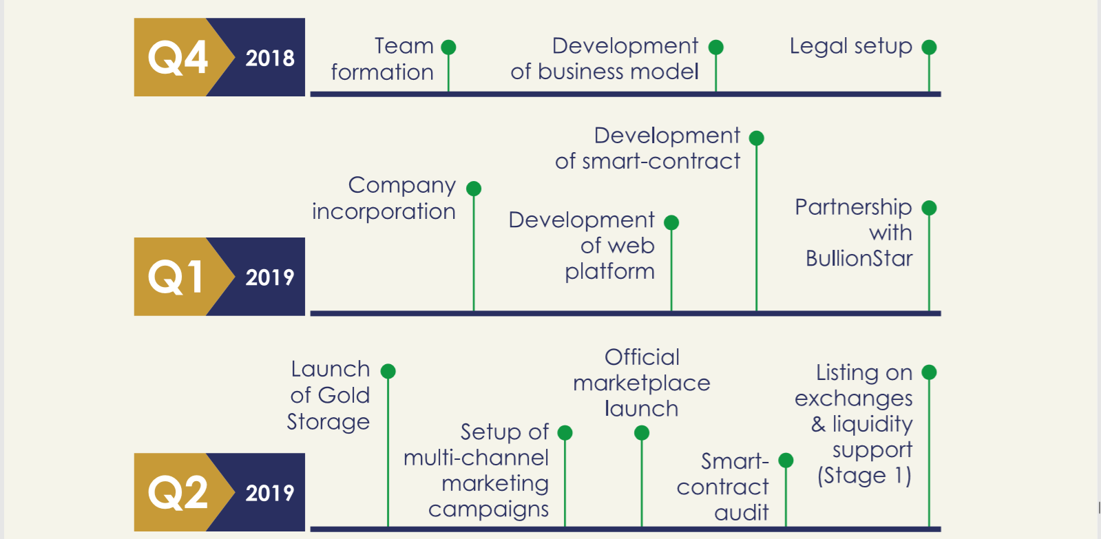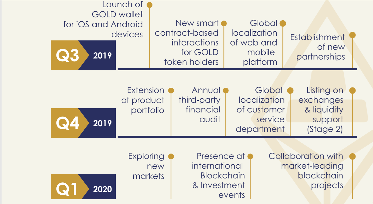 To bridge these gaps, they developed the GOLD TOKEN (an ERC-20 compatible token that is based directly on the Ethereum blockchain). With the GOLD TOKEN, investors and interested individuals purchase coverage in actual gold since the digital gold company have secure vaults for every tokens purchased in equivalence in physical gold purchased on the behalf of token holders and stored in a BullionStar-based secure vault (one GOLD TOKEN is equal to 1 gram of 99.99% FINE gold). All the physical gold are insured by the Chubb Insurance Company minimizing the risks with a full replacement value in case of anything. For transparency, holders of the GOLD TOKEN are free to carry out their due diligence by verifying the BullionStar live audit reports. The audit report is to let holders know and confirm the value of gold being stored. To fully bridge these gaps, the team has deployed the use of blockchain technology which has a promising potential in improving the demand and supply chain of gold.