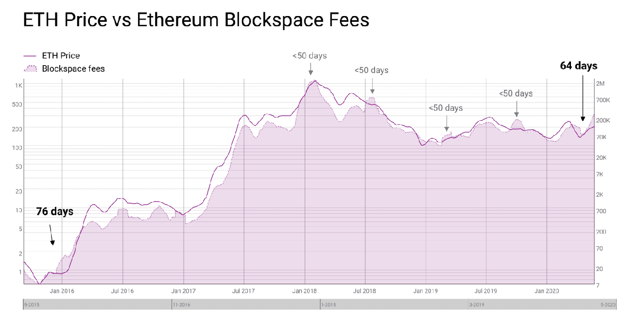 Looking at the chart above, you can completely recognize that one thing is the ETH price and the fee that the user has to pay for the transaction to be treated with correlation for the last 4 years.