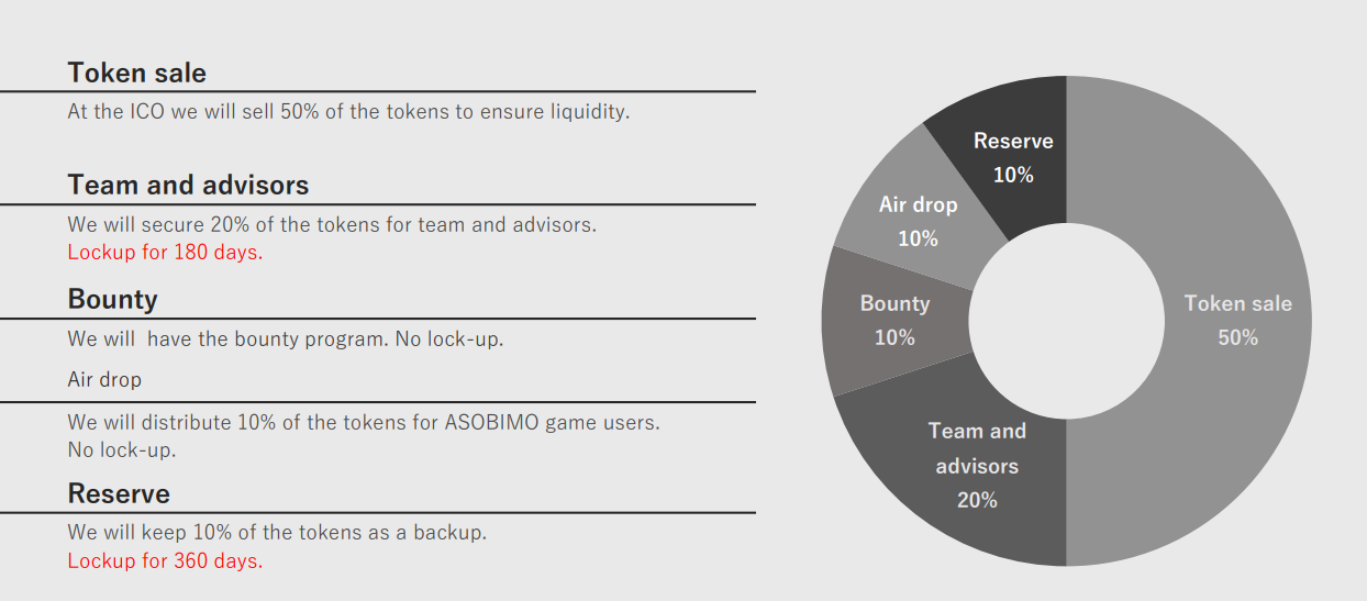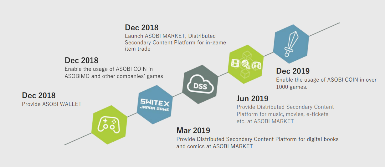 - Giải pháp: Asobimo DApps sẽ cung cấp một nền tảng nội dung thứ cấp phân tán với "Hệ thống bảo mật phân cấp" (DSS). blockchain sẽ cung cấp bằng chứng về quyền sở hữu nội dung không thể phủ nhận.