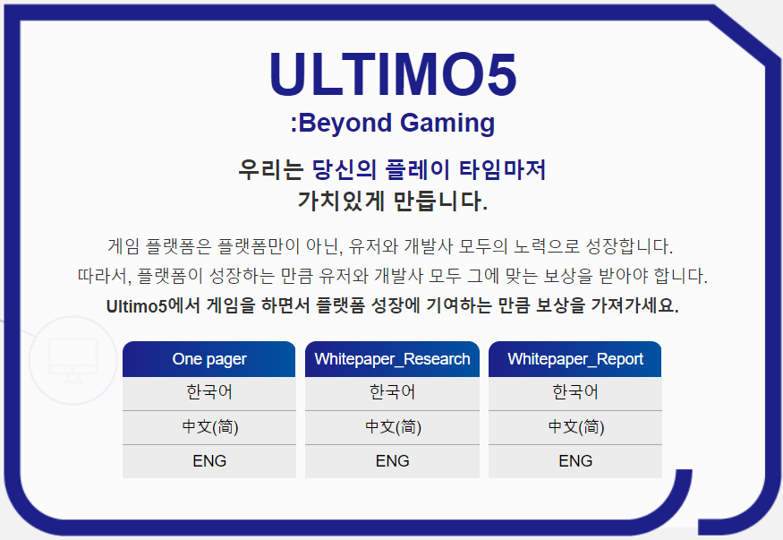 저희 알파버전(https://www.ultimo5.co.kr)에 오셔서 HTML 5 게임을 체험 할 수 있습니다. 현재 알파버전은 블록체인 시스템을 적용하지 않았으며 HTML 5 게임의 퀄리티를 체험 해볼 수 있도록 런칭하였습니다. 개발 중인 베타 플랫폼에서는 저희가 기획한 보상시스템 부터 스마트컨트랙트, 오픈플랫폼을 경험 할 수 있습니다.