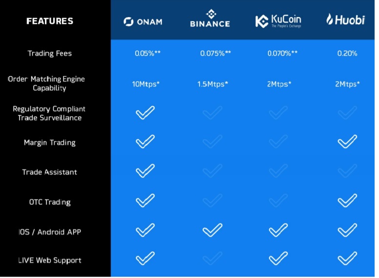 Conclusion: There is lot of competition in the block chain technology and there is constantly a increase in the number of exchanges and trading platforms. Onam stands out of the box with its unique features and modern technologies in data security, scalability of 10 million transactions per second with 40 nanosecond latency.There is absolutely no equal competitor for Onam and very soon it is going to rule the world of crypto currency exchanges.