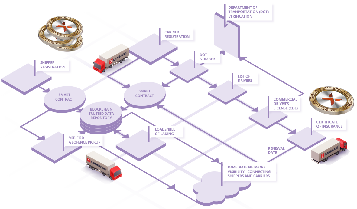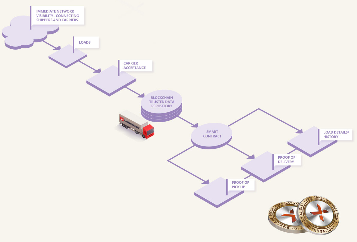 LaneAxis Blockchain menyuntikkan keamanan total dan integritas data ke dalam sektor pengangkutan dan logistik yang terkenal tidak teratur. Memanfaatkan kontrak pintar pada buku besar abadi blockchain, Shippers and Carriers kini dapat saling berhadapan langsung, melewati pialang kargo pihak ketiga yang mahal. Blockchain LaneAxis memverifikasi dan menyimpan semua data dan dokumen penting yang terlibat dalam pergerakan pengiriman, termasuk kontrak Shippers, sertifikat asuransi, nomor registrasi Departemen Transportasi (DOT), dan informasi License Driver Komersial (CDL). Selama transportasi, buku catatan LaneAxis dan menyimpan data penting secara real-time, termasuk bukti-dari-pickup, pelacakan lokasi GPS, manajemen pengecualian, dan bukti pengiriman. The LaneAxis Token berfungsi sebagai kunci API yang memberikan akses ke Ekosistem Blockchain LaneAxis.