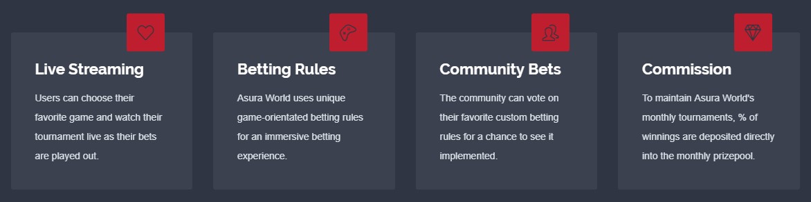 Asura World eSports betting is an entirely new unique experience. The Asura World platform looks to assist the transition from traditional eSports betting through cash and skin wagers, into a more fair and ethical market using digital currency. The platform will create a friendly an environment for gamers to follow and participate in eSports events, as well as make bets and wagers on their favorite teams and outcomes.