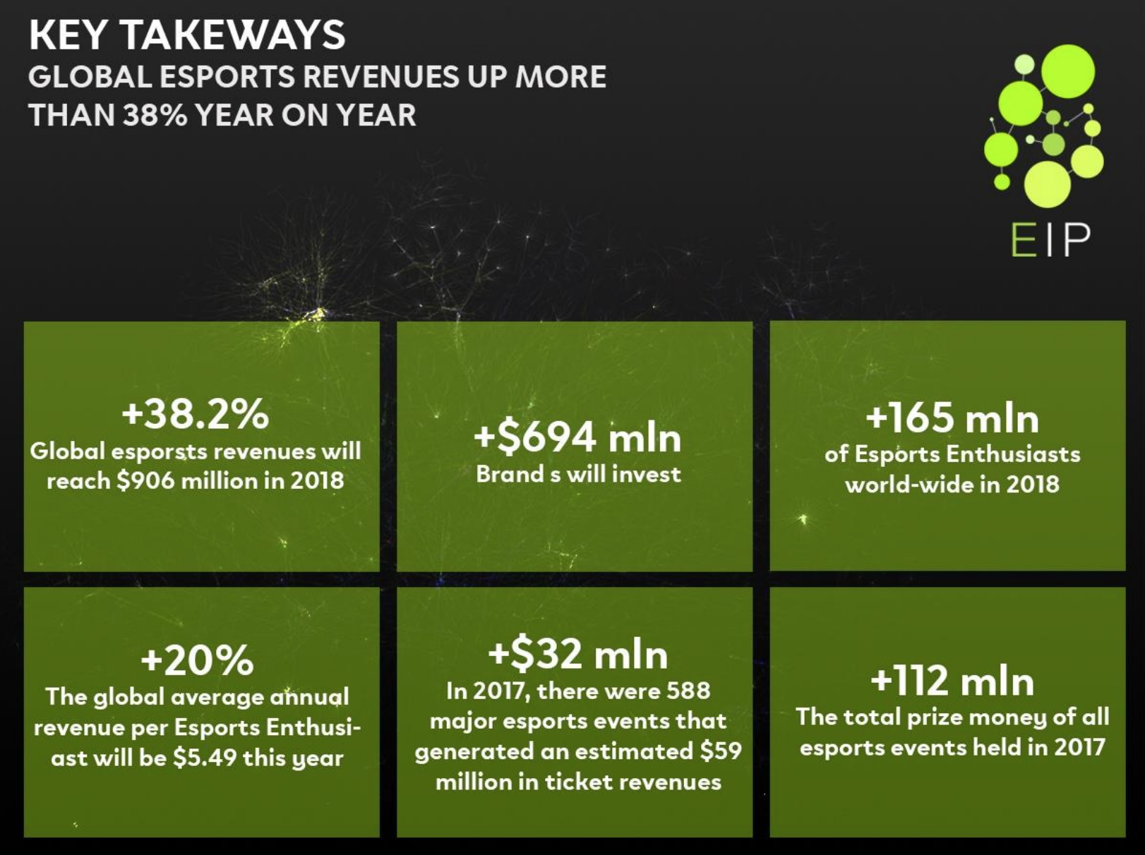 Meskipun demikian, eSports tetap merupakan bisnis yang sangat menguntungkan. Dan apa yang akan terjadi jika Anda menyadari potensi 80% sisanya, yang hanya mendambakan perhatian dan permintaan? Ini adalah peluang besar untuk menerapkan, setidaknya, model bisnis periklanan penyelenggara. EIP tahu cara melakukan ini.