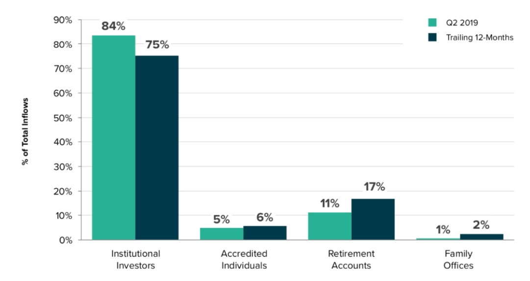 在今年第二季度中,机构投资者和退休基金这两个大型机构投资者分别占了84%和11%,两者相加总比例达95%。而个人投资者只占5%。
