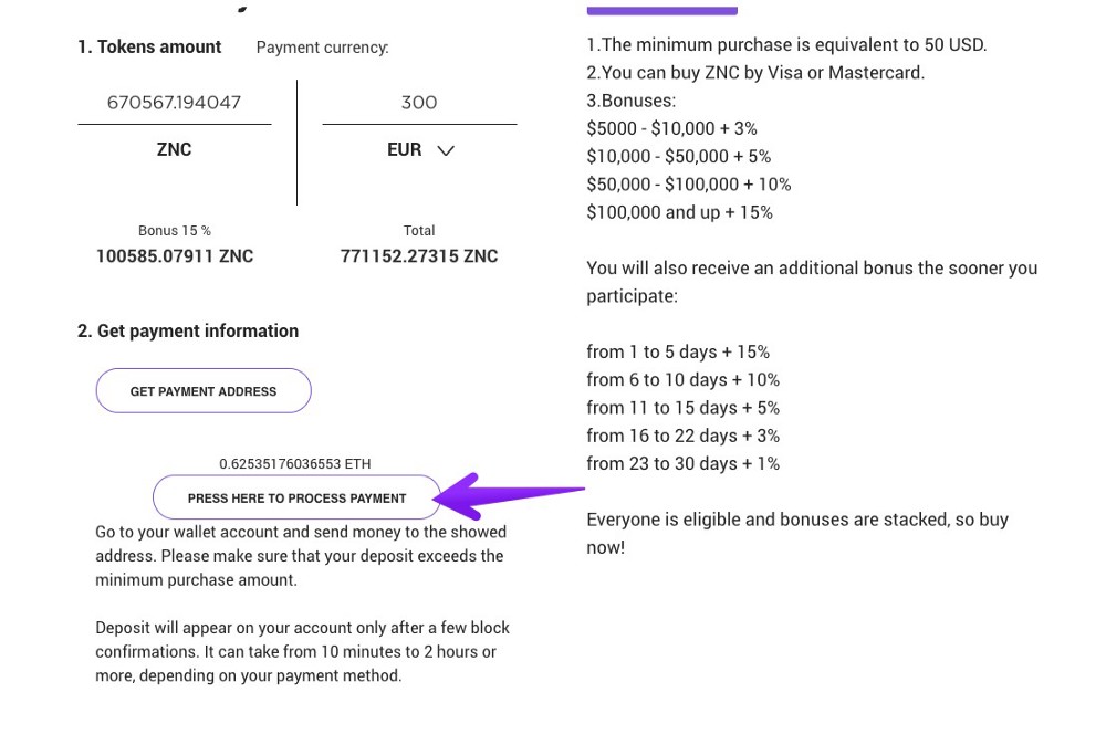 - That’s it :) Wait for confirmation from Ethereum blockchain and ZNC tokens will show up in your dashboard.