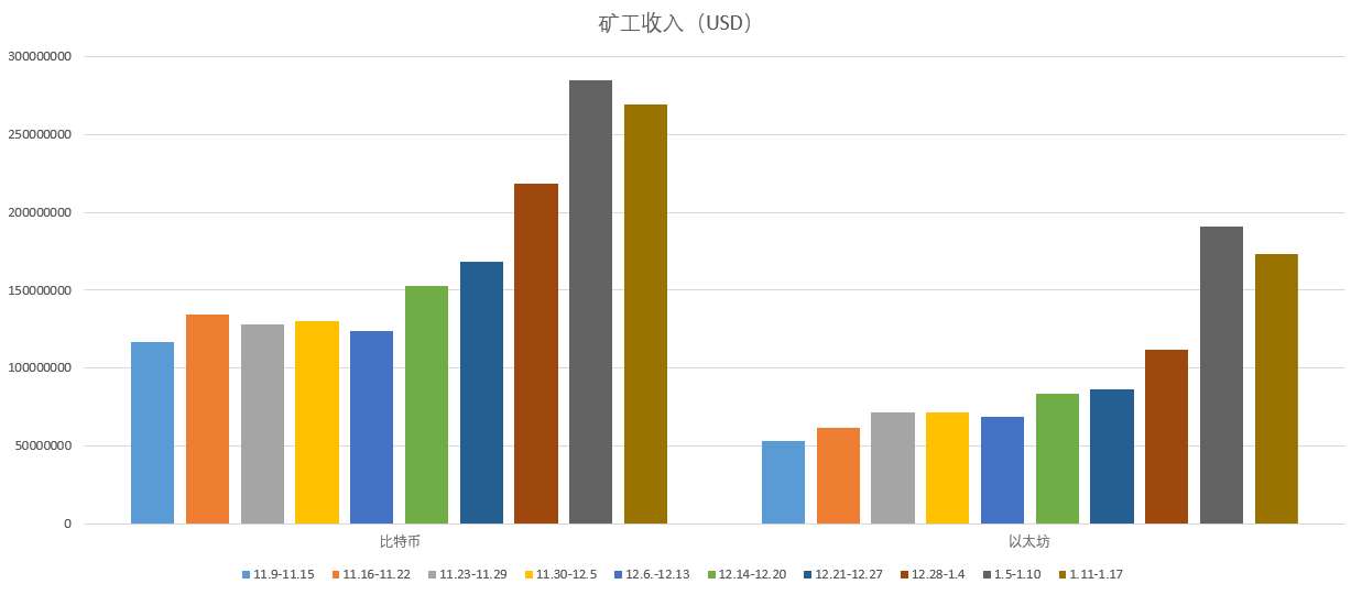 Last week, Bitcoin miners' revenue was 7,350 BTC, or about 269 million U.S. dollars, a decrease of 5.28% from the previous month; Ethereum's miners’ revenue was 148,300 ETH, or about 173 million U.S. dollars, a decrease of 8.99% from the previous month.