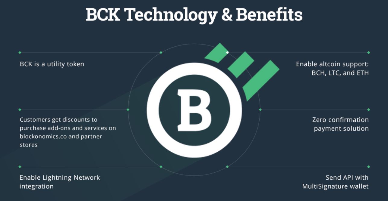 BCK token benefits and technology, taken from the Blockonomics Litepaper: https://ico.blockonomics.co/docs/Blockonomics_Litepaper.pdf