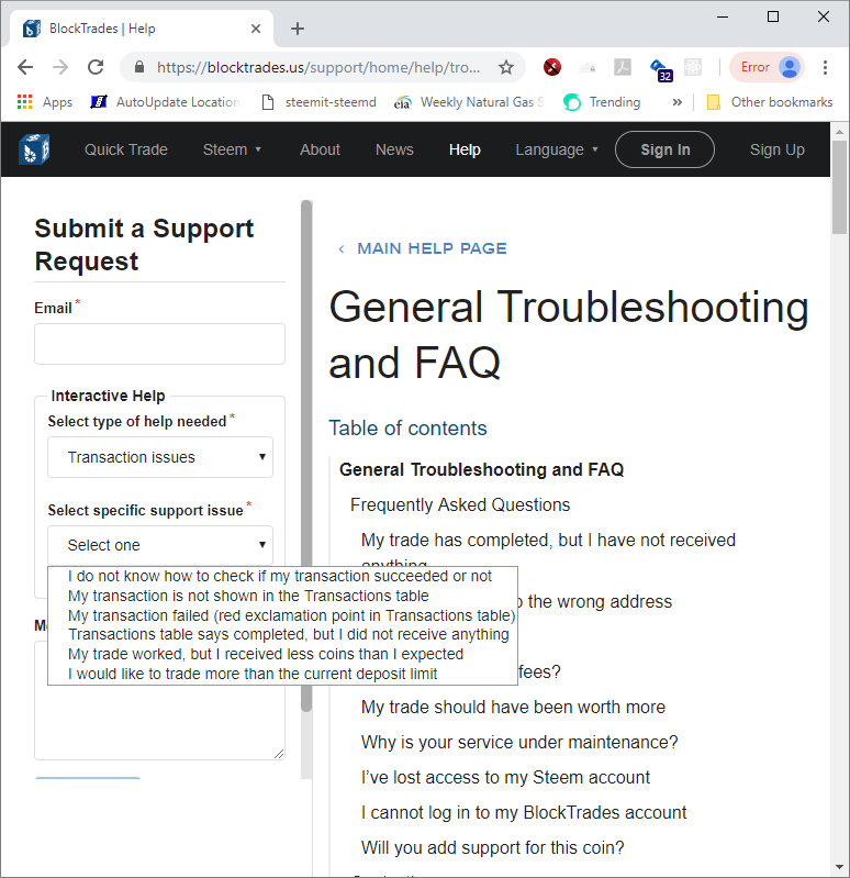 For the past few months, we've been working intensely to update the code for our website (https://blocktrades.us) to add an integrated “Help and Support” system. The goal of this system (accessible via the new Help menu at the top of our web site) is to help users learn how to use our site most effectively and decrease the time it takes for us to solve customer problems.