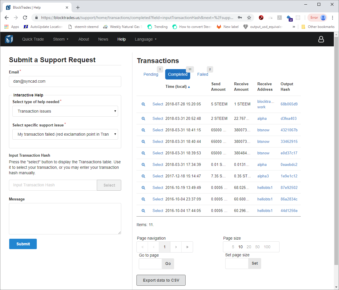 If the interactive help doesn’t resolve your problem, you can submit your completed Support Request, which will provide us with the info we need to resolve the problem. Most commonly this will be necessary when a transaction failed for some reason. In such cases, you will be able to select the problem trade from your transaction history table. In our ideal world, you’ll be able to request the help you need in 7 clicks, without having to check your notes or open another browser, and then get a fast response that we have fixed the issue.