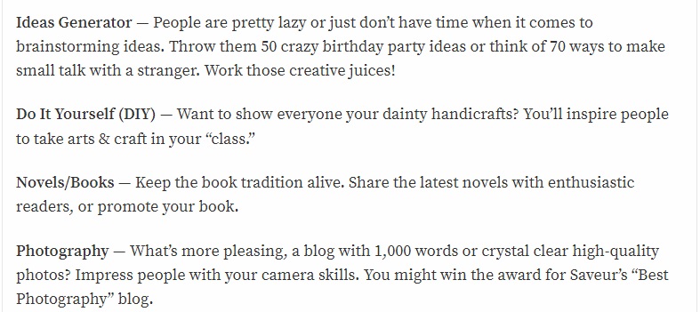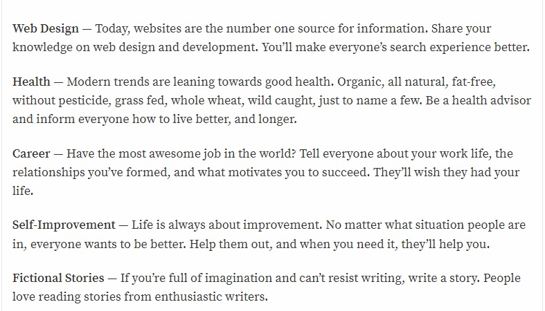 Don’t know what topic to start your blog on? Here are some topic ideas to get you thinking about what you could focus on.