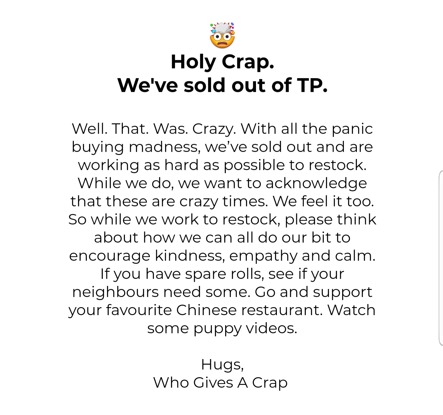 Australia is, legit, tp crazy at the moment that even sites like whogivesacrap.org has run out.