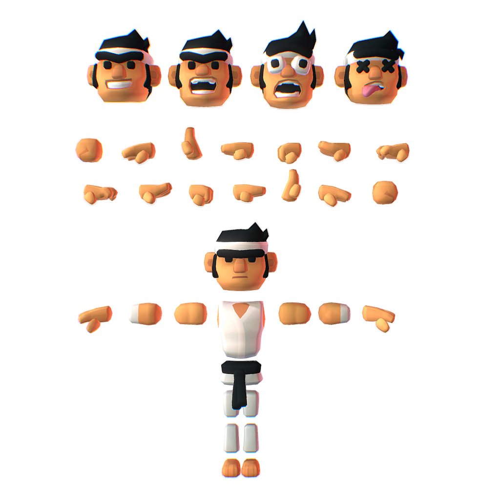 Lee is a low poly video game hero character. He is rigged to a standard Maya HIK skeleton. His limbs are modular which allows them to be switched out with limbs from other Smashy Craft characters and he comes with a range of hand gestures and facial expressions. You can apply Mixamo animations to Lee by uploading him to the Mixamo website, applying any animation you want there and then downloading him again.