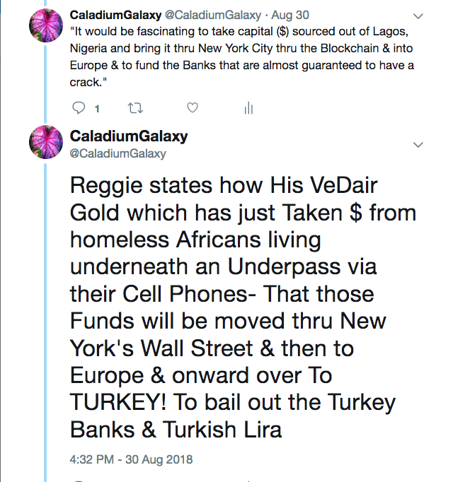 Then Via the VERI TOKEN & VEDAIR PLATFORM brought to you by REGGIE himself- that money from the homeless Africans will be sent over to WALL STREET- Via the BLOCKCHAIN. From Wall Street on over to EUROPE (meaning LONDON, do doubt) where they will take their CUT. YES!!!!!! Reggie actually said that - that Europe will take their CUT- their CUT of the homeless Africans money, that is. Then ON OVER TO TURKEY- to bail out the lira. PRICELESS absolutely fucking priceless. Reggie Middleton wants to take homeless Africans money & send it over to Bankers in Turkey to BAIL OUT their Failing BANKS & along the way- Wall Street & London can get their CUT too.