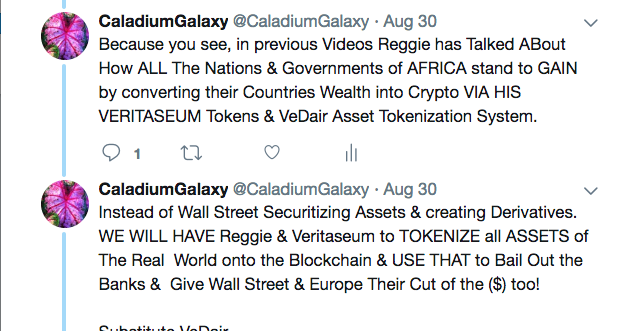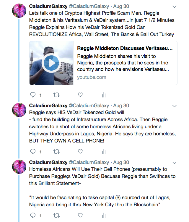 Anyway way here's a few posts about REGGIE Middleton touting Veritaseum & one of his recent videos -