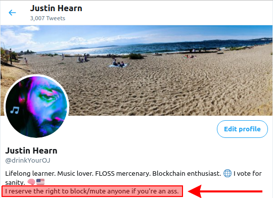 (I used to keep a rule about giving people a warning about "meaningfully contributing to the conversation" before muting them, out of fear of tyrannically blocking one's Freedom of Speech…but I no longer bother. I just make sure I'm muting/blocking for the right reasons, as opposed to just making them "shut up" because I disagree with them.)