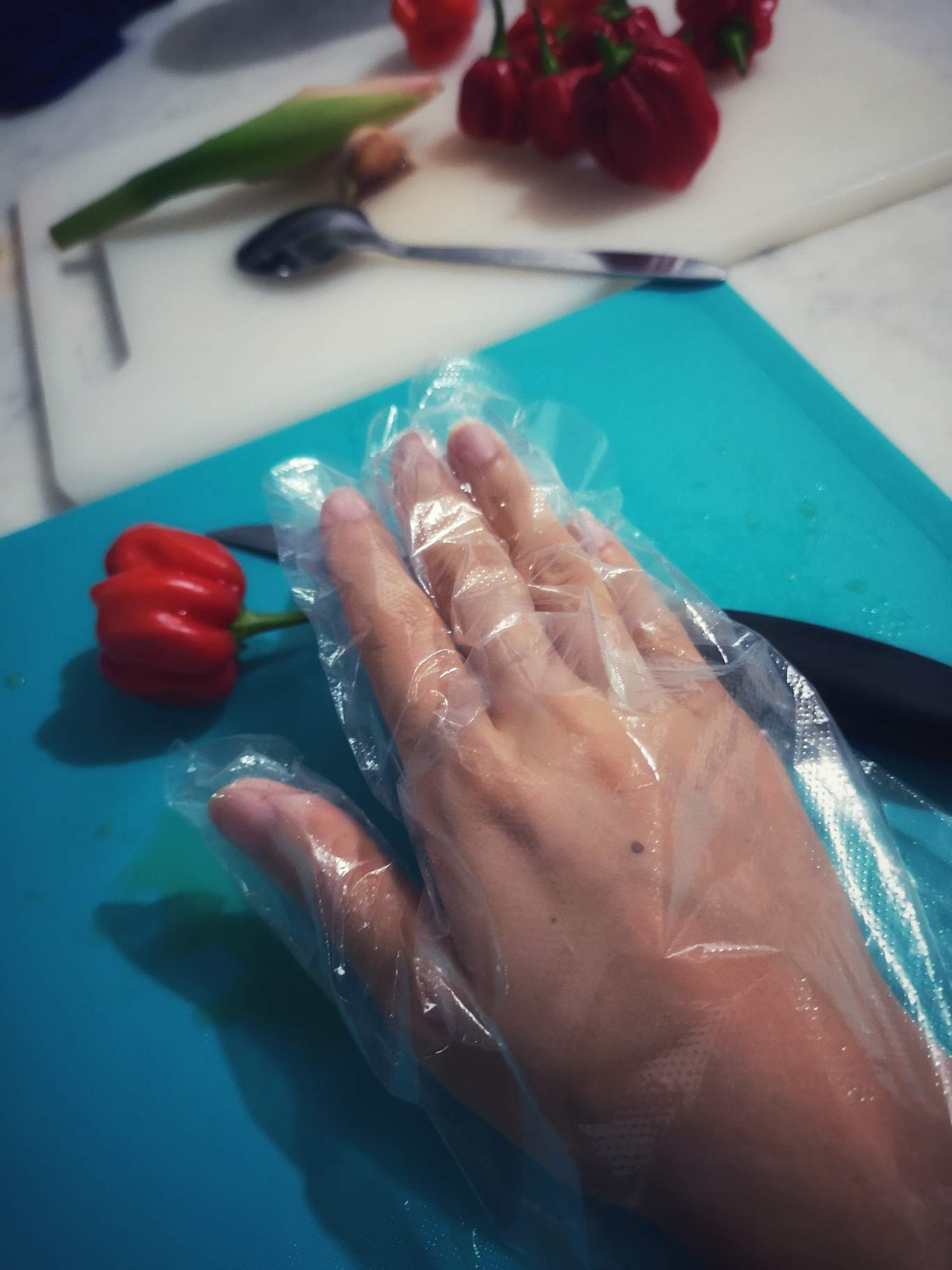 Imagine how spicy it is when the chilli vapor actually can get through the plastic gloves.