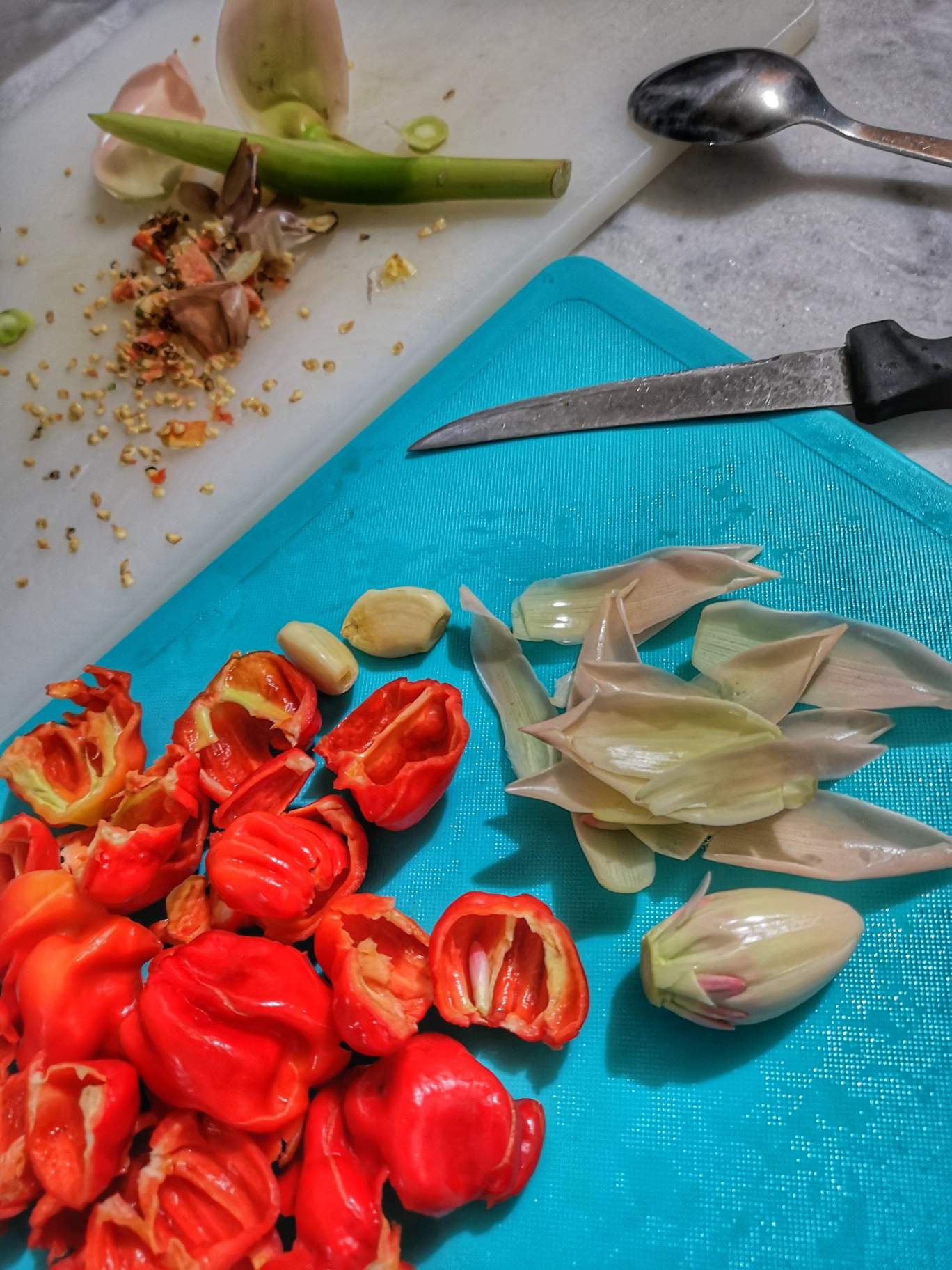 It's time to removed the chillies seeds and also skinned the garlic and bunga kantan.