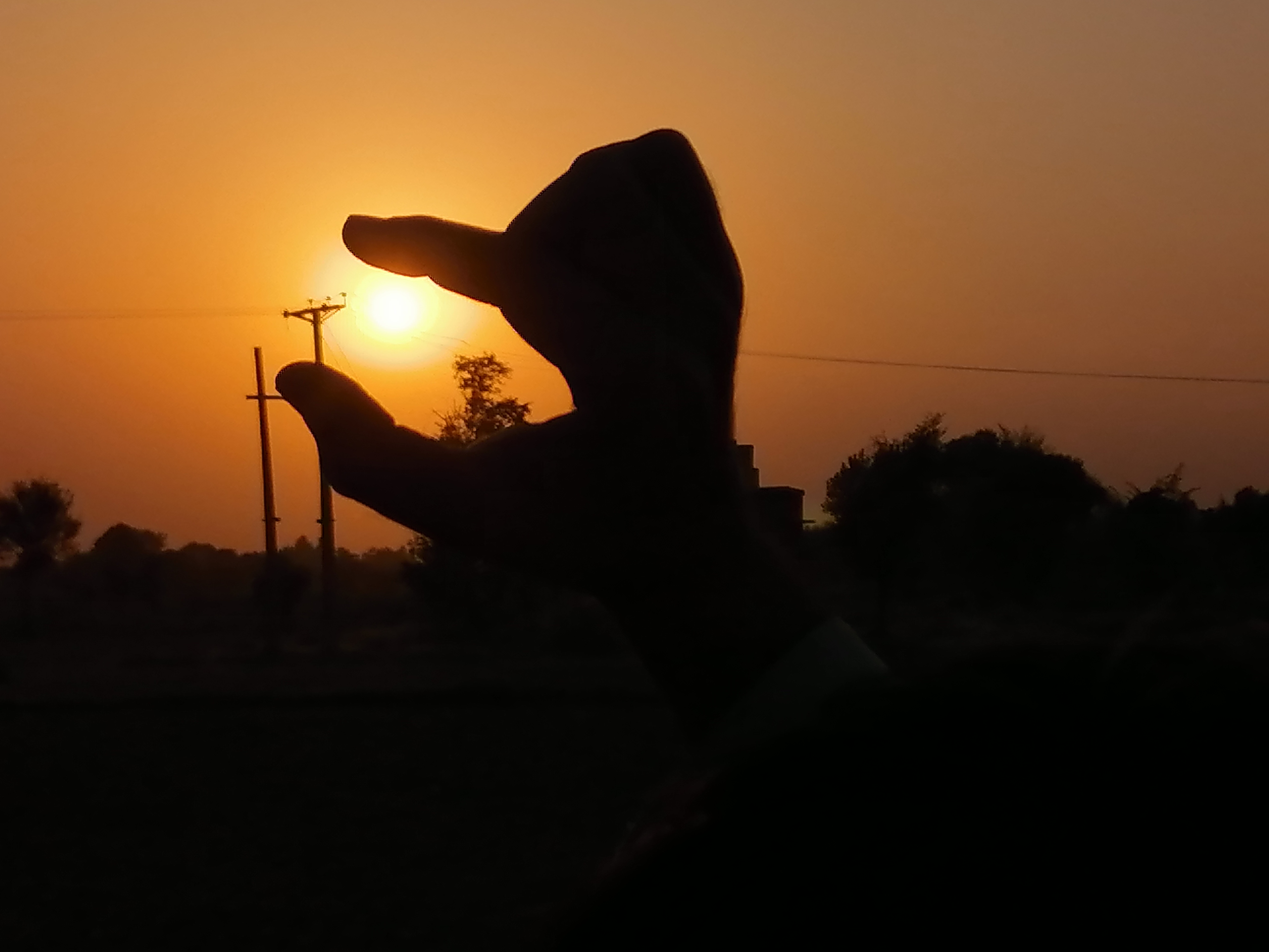 I took this picture when there was an electric pole in front of the sun and this was the view of the sun between my two fingers.