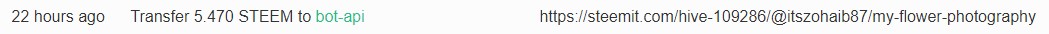 I send a 5 steem for getting addtional vote from @bot-apiitszohaib87 (50)in #blog • 2 years ago proof i send a 5 steem to @bot-api I send a 5 steem for getting addtional vote from @bot-api