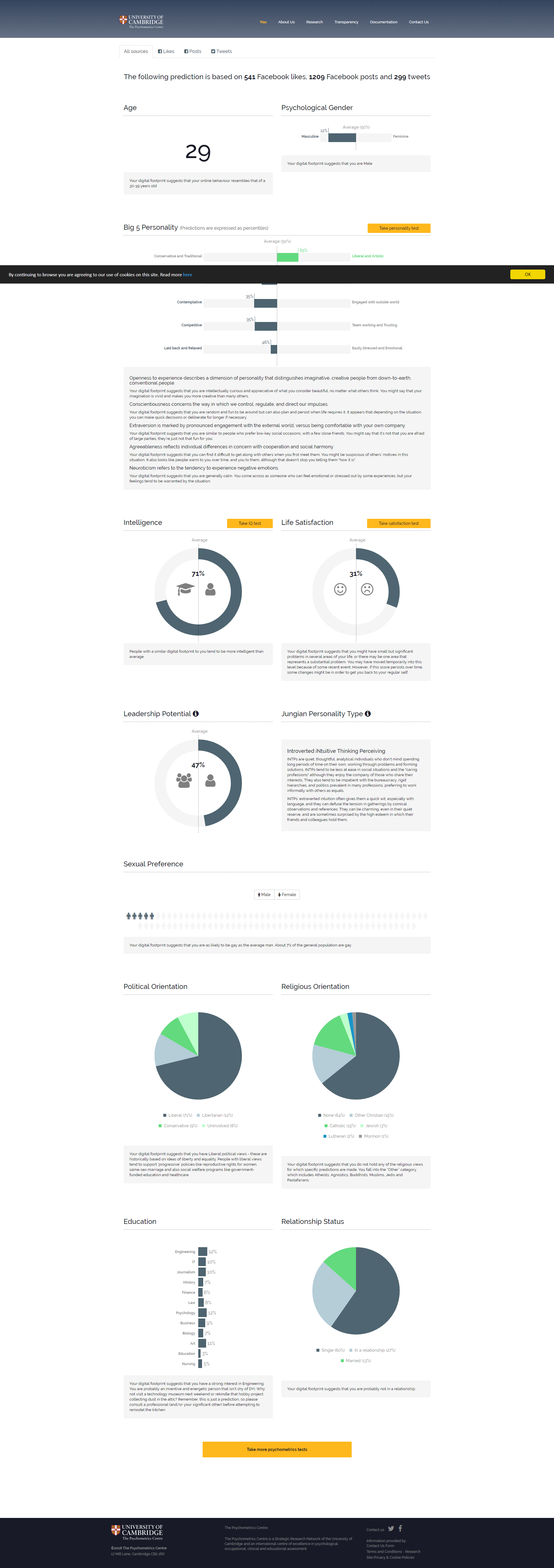 Developed by The Psychometric Center at the University of Cambridge, Apply Magic Sauce uses Artificial Intelligence to review your social media profiles and offer predictions on age, gender, personality, intelligence, and political orientation. I associated my Twiteer and Facebook with it and the results can be found below: