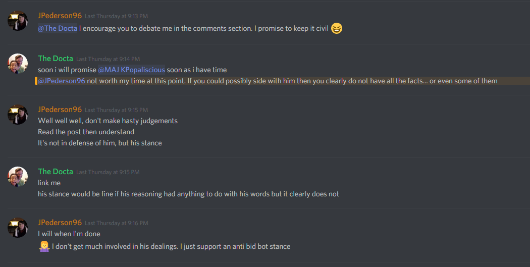 Michael announced in the #Alliance Discord that he would be creating a companion account to sneaky-ninja that would fight against @grumpycat theft. Obviously theft caught my attention so I DMed him asking about it and he basically said flagging + self voting = theft. I said the link was weak. After a bit, I mentioned in the server that I wanted to debate him over bid bots and he agreed.