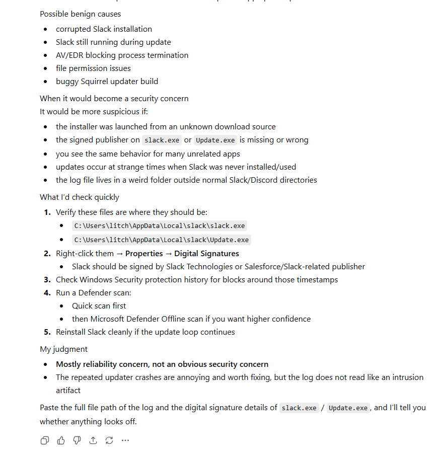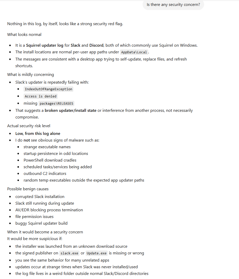 It looks like a standard Slack/Discord updater log, not malicious code. The paths, executable names, and message patterns all match normal Squirrel-based app updates.What’s actually wrong on your machine