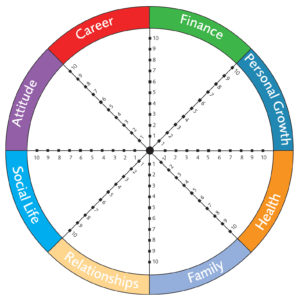 One such tool is the Wheel of Life (or Work). created by Paul J. Meyer, where each area of life is mapped on a circle, like the spokes of a wheel. What each section on the wheel represents can be defined by the client, or if client is unclear, a standard template can be used, as shown in the image below.