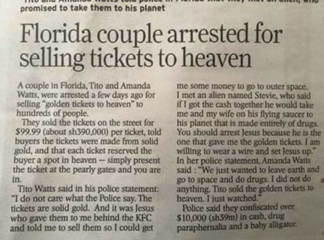 In the past days, a bizarre story became viral on various social media platforms: a couple from Jacksonville, Florida, was supposedly arrested for “selling golden tickets to heaven.”