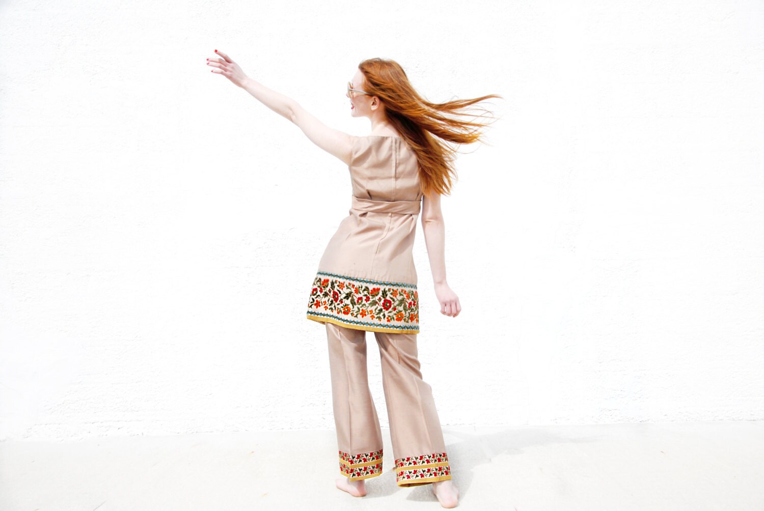And then, there's the mini dress. I'm addicted to them. Especially the ones you can wear with matching pants to switch it up a bit, like this adorable two-piece tapestry set from the late 1960s.