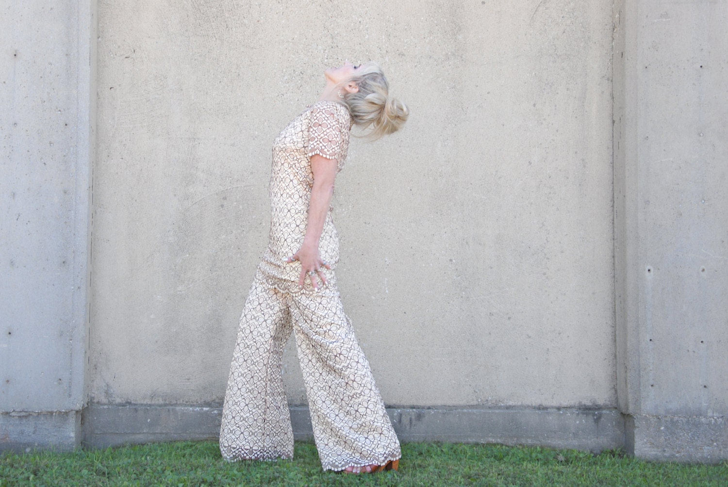Or this fantastic 1970s two-piece all-lace mini dress with matching high-waist palazzo pants!
