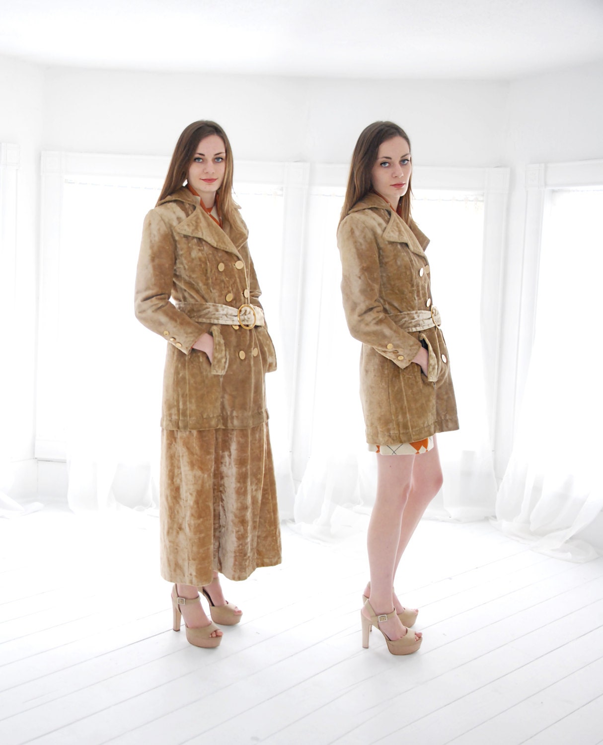 If your current season is a spring or autumn, this vintage velour jacket from the 1970s goes from a peacoat to a trench with a matching zippered panel added to the bottom.