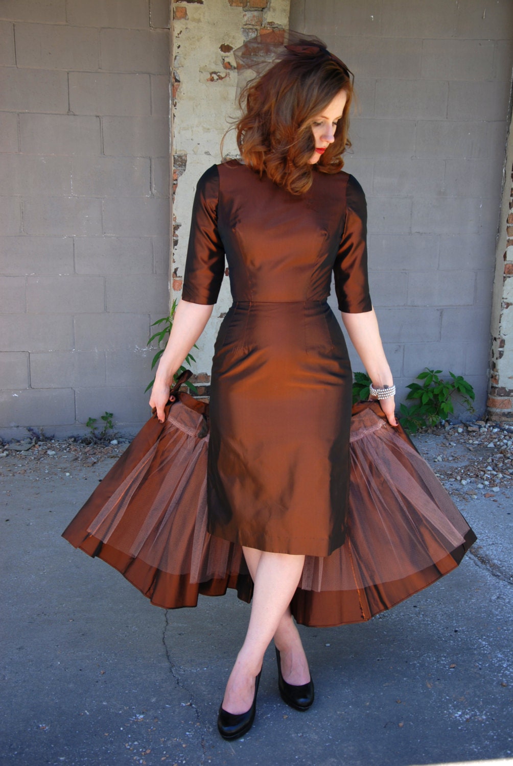 A form-fitting vintage 1950s copper sheath dress becomes fuller at the hips with its matching overskirt with a layer of tulle. The set even comes with the matching veil headpiece! Such a fun set!